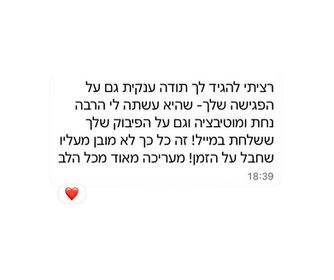 ✔ ובנוסף - אני זמינה לך ל-10 ימים אחרי הפגישה ואעזור לך לדייק ולשפצר את התוכן תוך כדי תנועה.